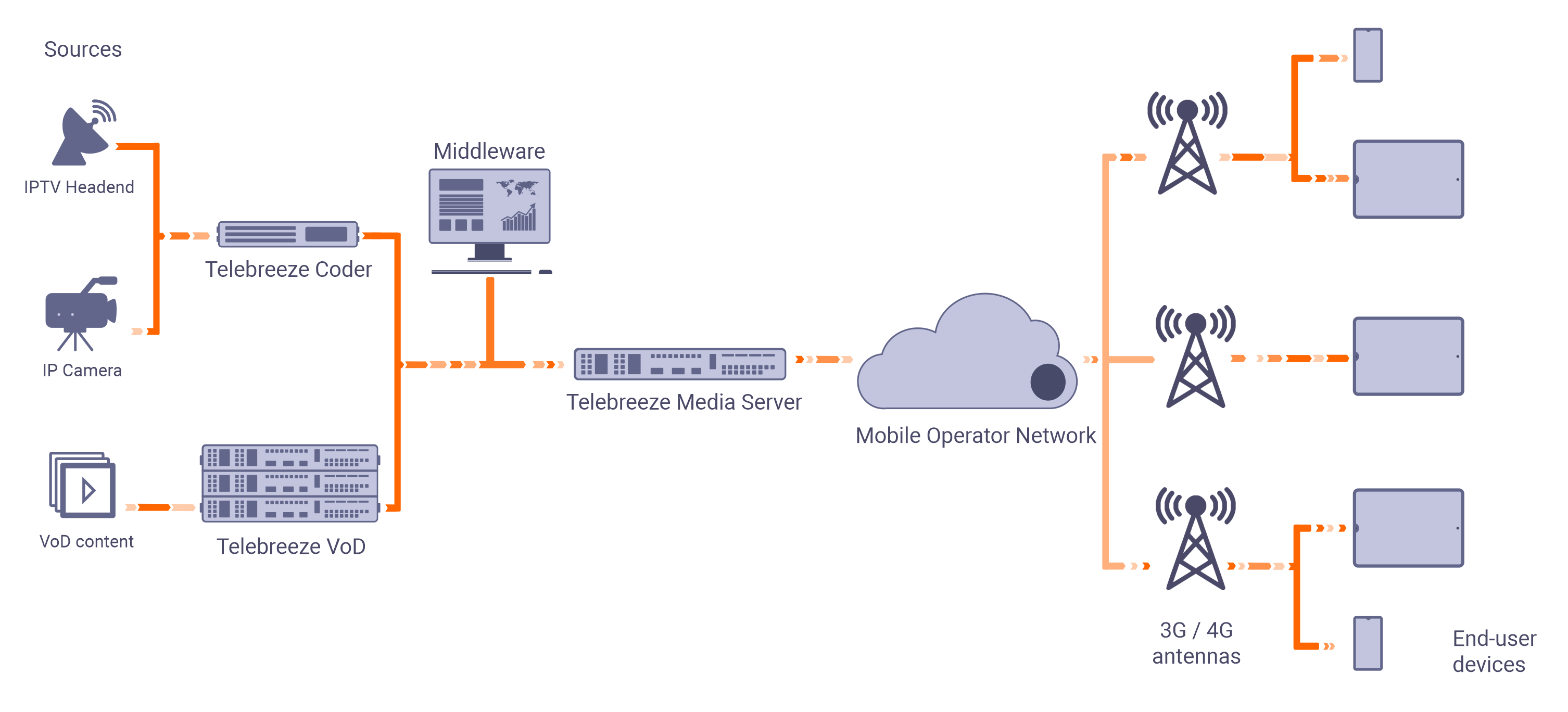 To launch Mobile TV you need: a management system, a multi-platform player for mobile applications, media servers and transcoders.